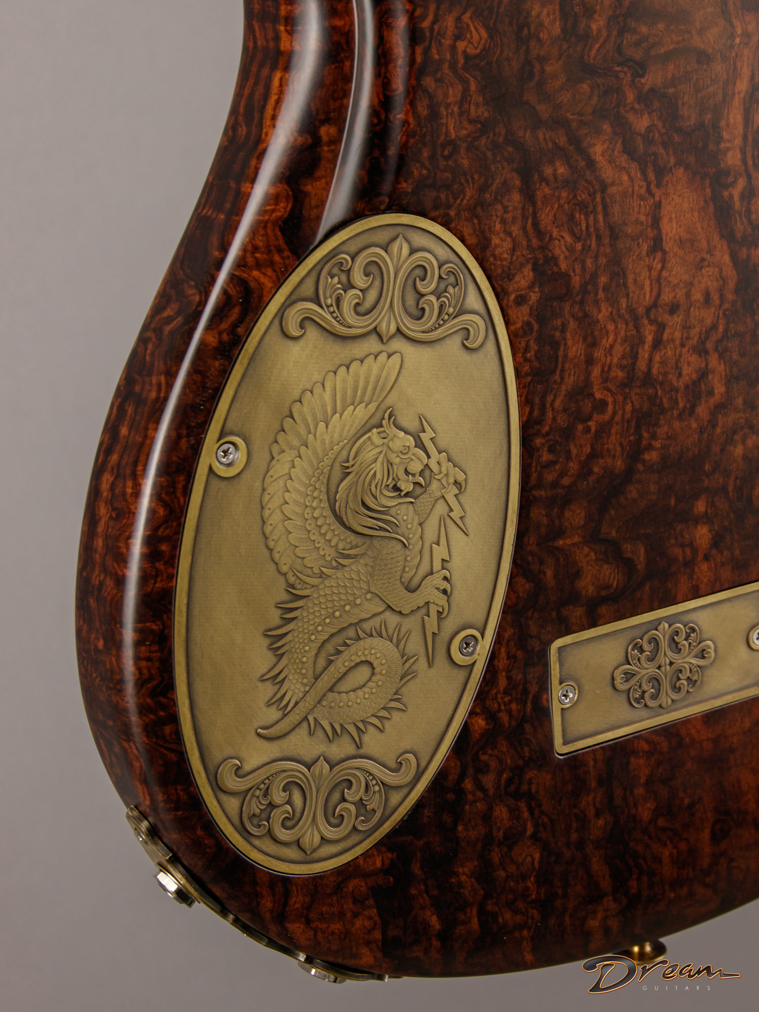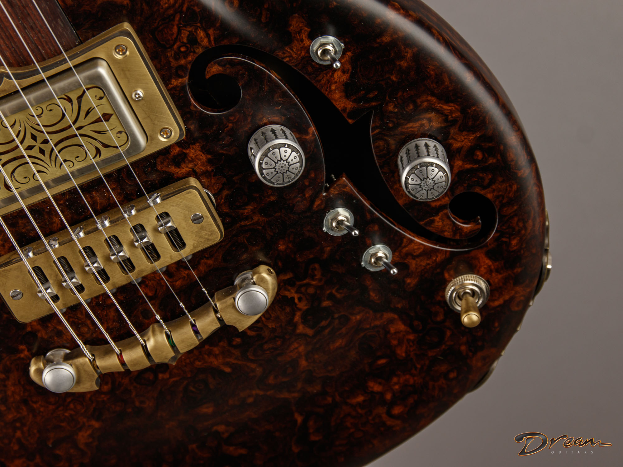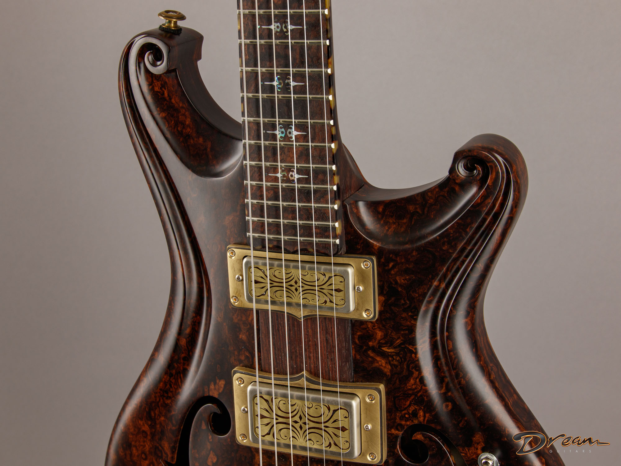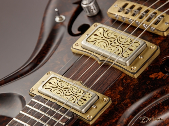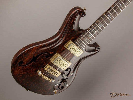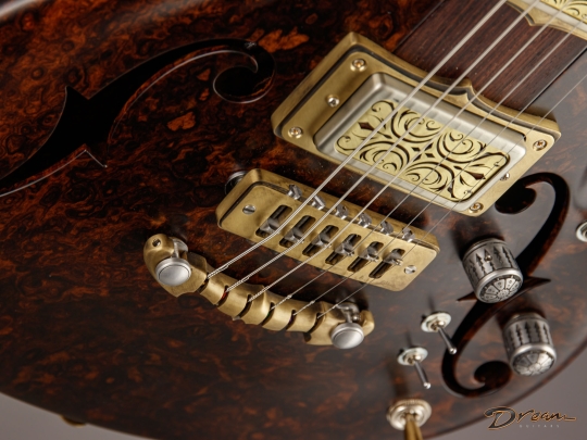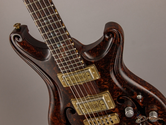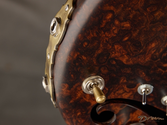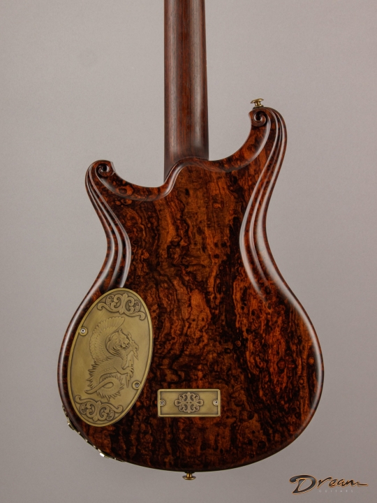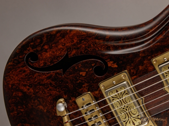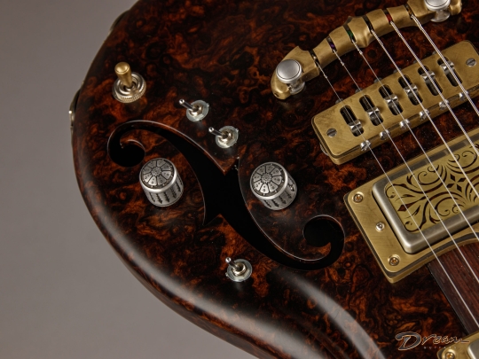 The 2024 Scott Walker Legacy Santa Cruz Hollowbody in all burled Rosewood is an instrument you don’t see—or hear—every day. The level of craftsmanship and detail is astounding: from the hardware and pickup covers to the tone and volume knobs, every component is visually arresting. On the back, a brass backplate is adorned with a motif of a Qilin, an Eastern Asian mythological creature often regarded as a harbinger of prosperity and serenity—another detail that elevates this guitar far beyond the ordinary.