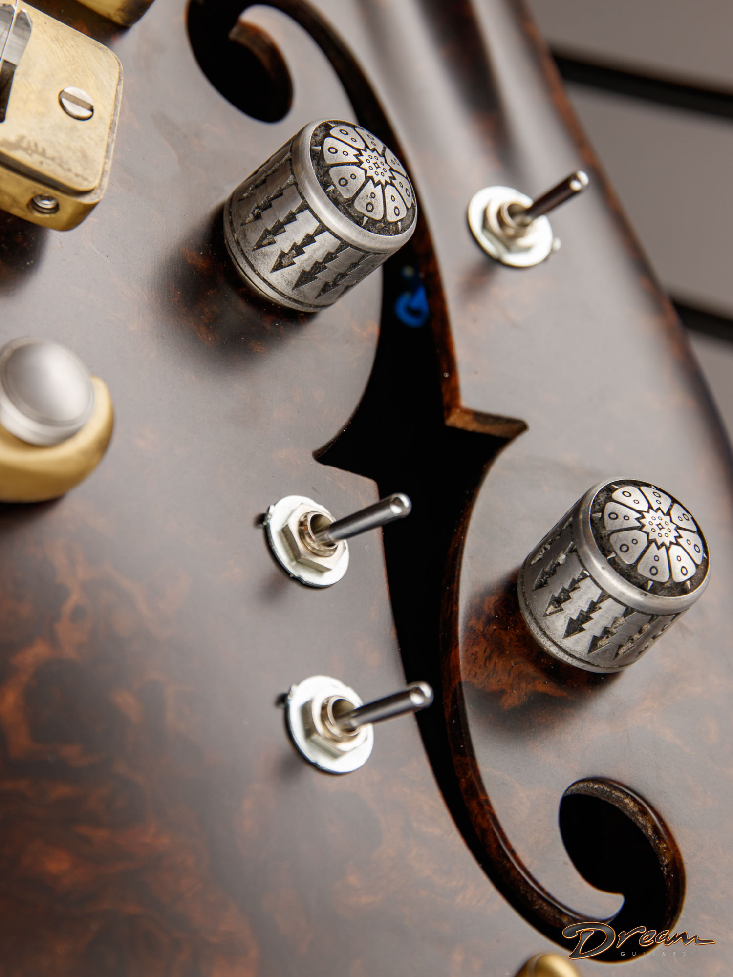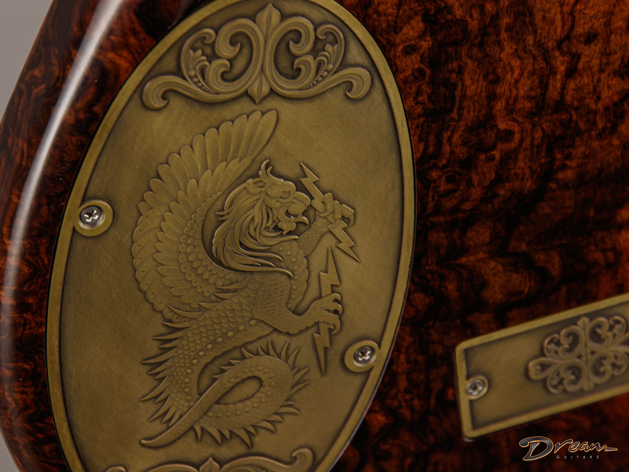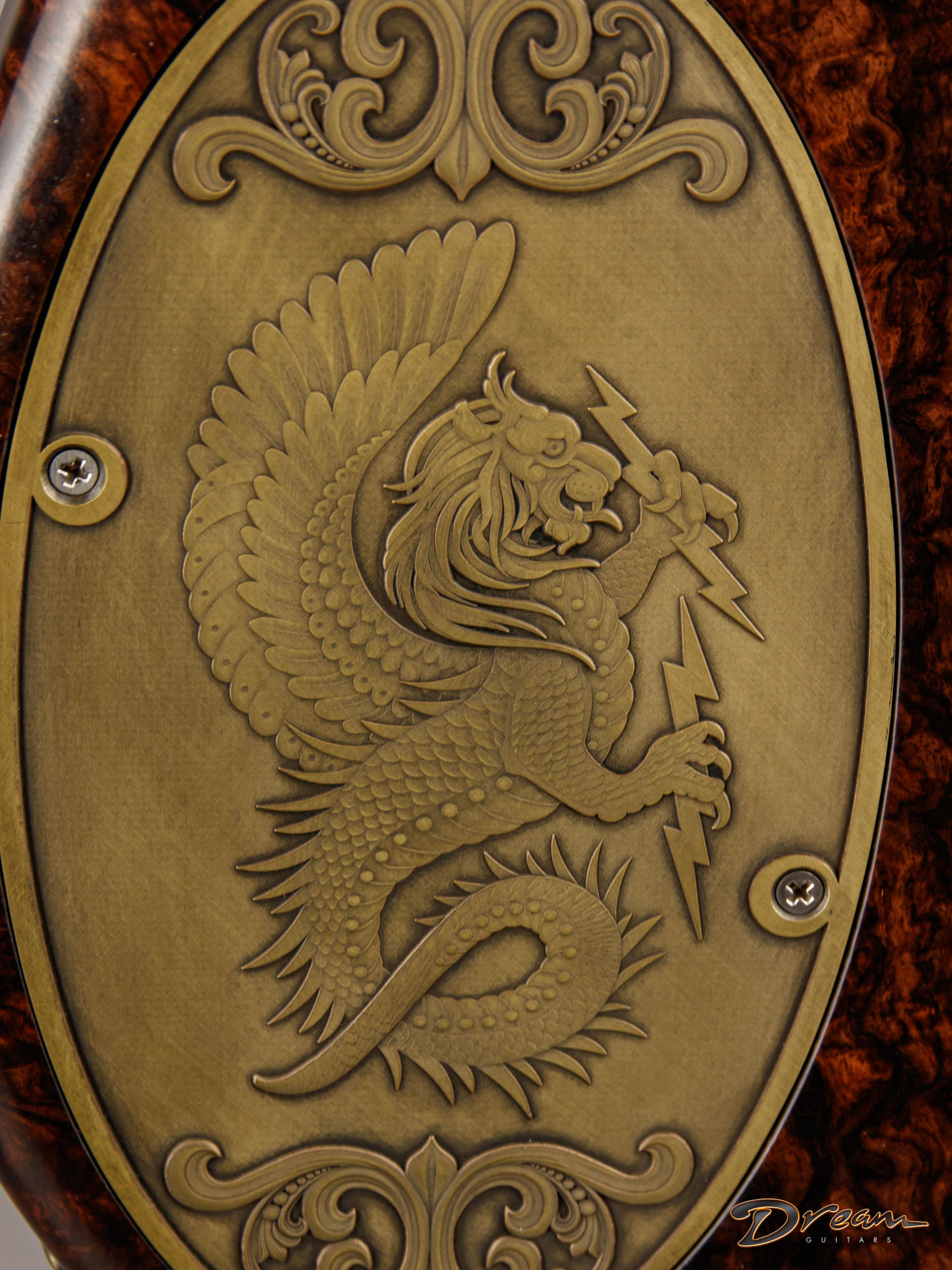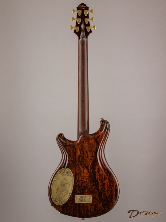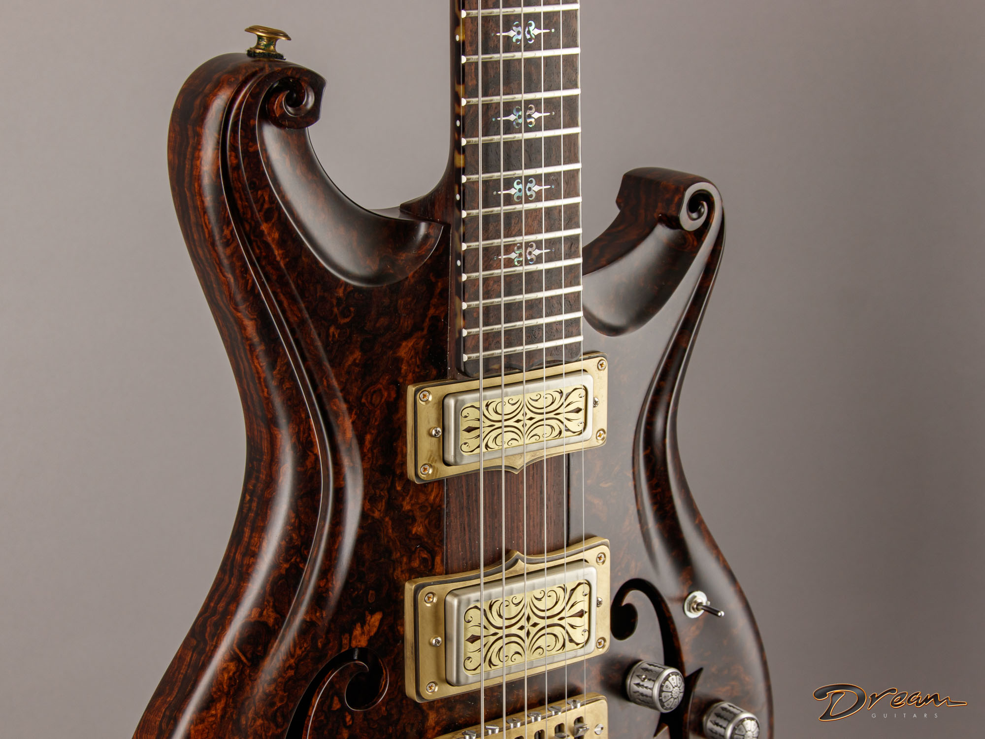 The 2024 Scott Walker Legacy Santa Cruz Hollowbody in all burled Rosewood is an instrument you don’t see—or hear—every day. The level of craftsmanship and detail is astounding: from the hardware and pickup covers to the tone and volume knobs, every component is visually arresting. On the back, a brass backplate is adorned with a motif of a Qilin, an Eastern Asian mythological creature often regarded as a harbinger of prosperity and serenity—another detail that elevates this guitar far beyond the ordinary.