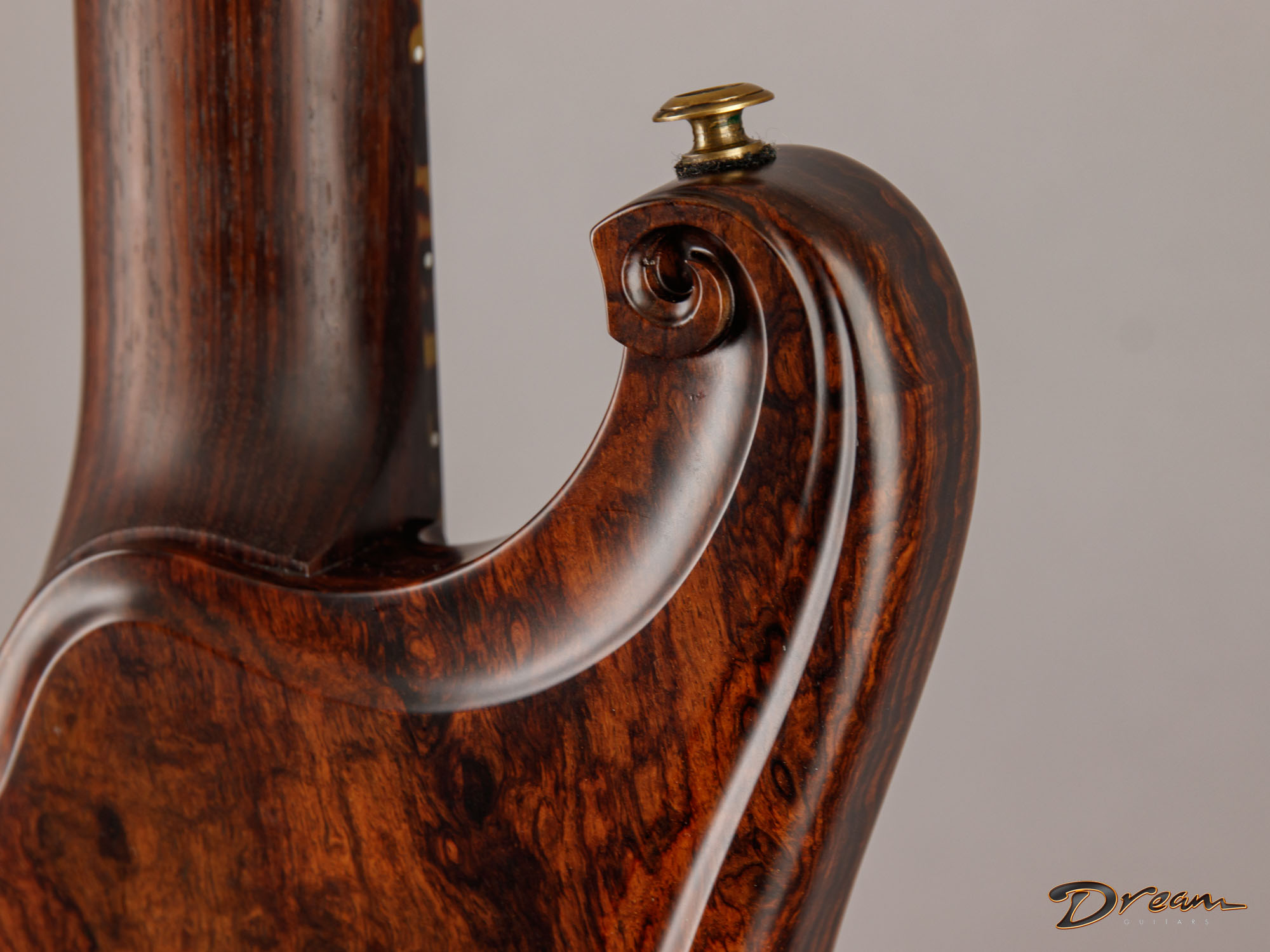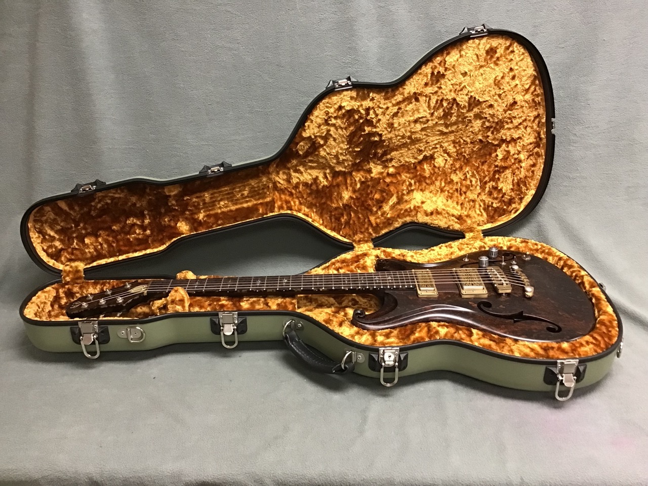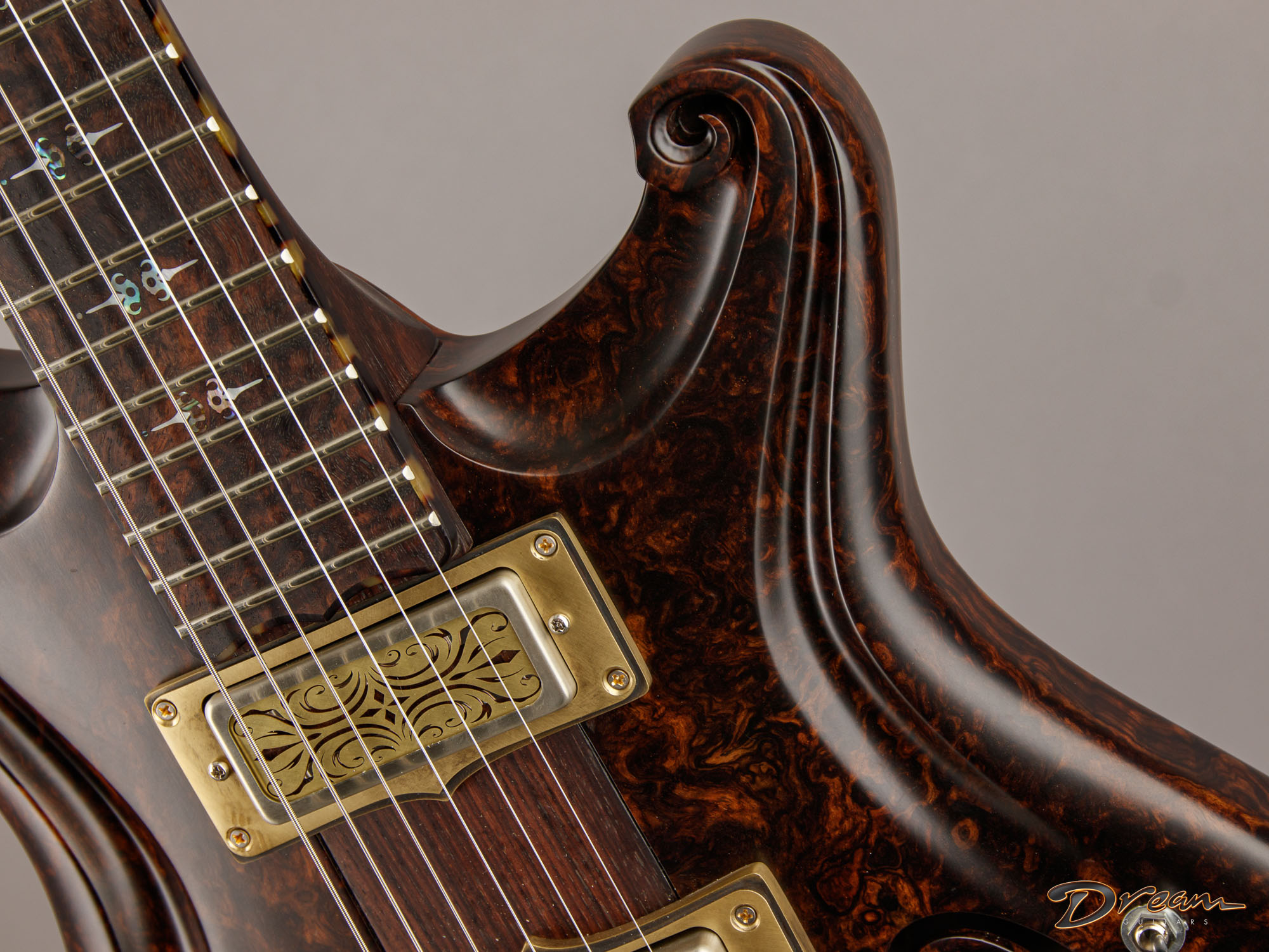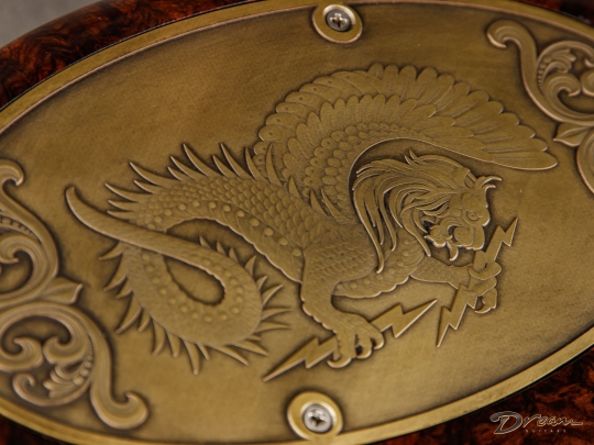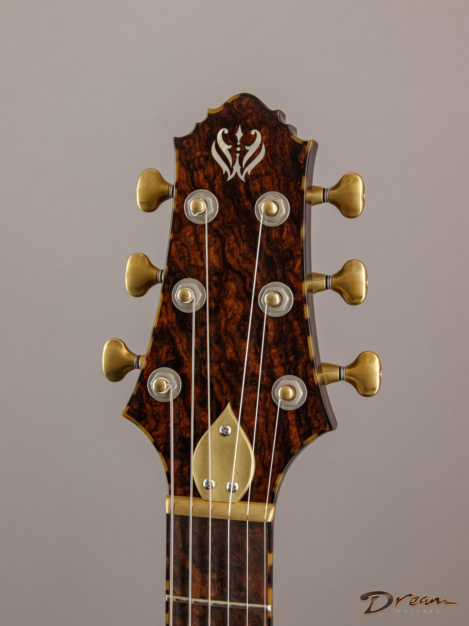 The 2024 Scott Walker Legacy Santa Cruz Hollowbody in all burled Rosewood is an instrument you don’t see—or hear—every day. The level of craftsmanship and detail is astounding: from the hardware and pickup covers to the tone and volume knobs, every component is visually arresting. On the back, a brass backplate is adorned with a motif of a Qilin, an Eastern Asian mythological creature often regarded as a harbinger of prosperity and serenity—another detail that elevates this guitar far beyond the ordinary.