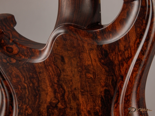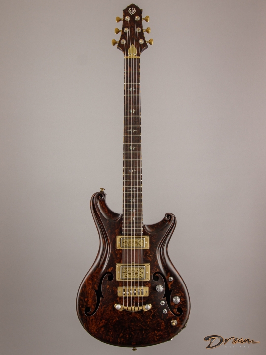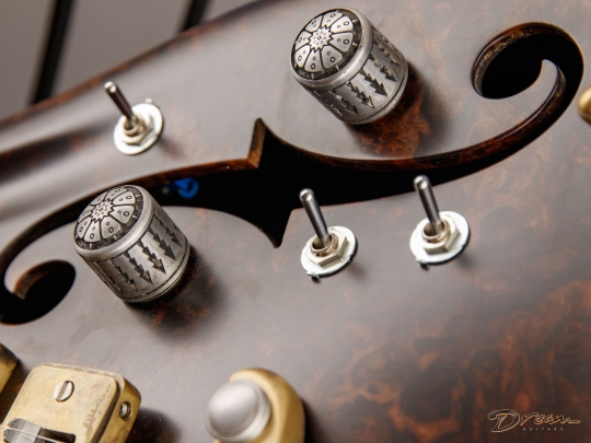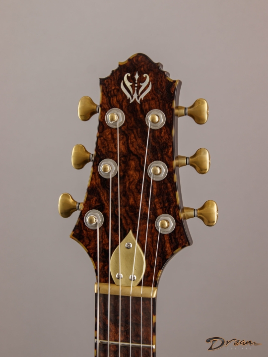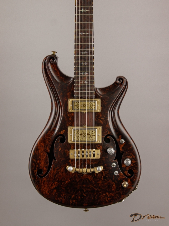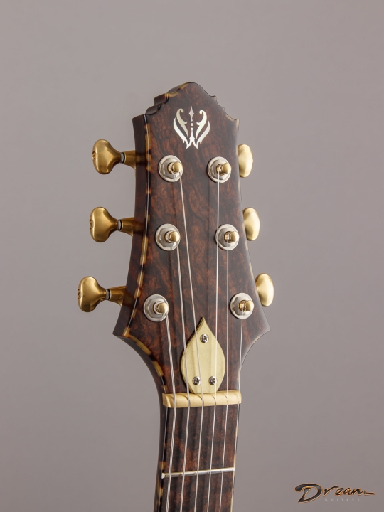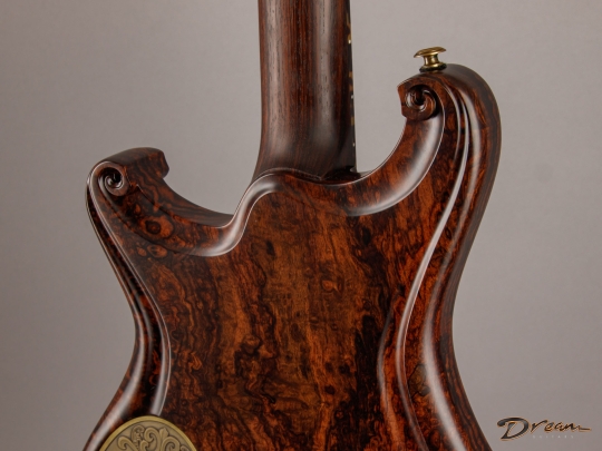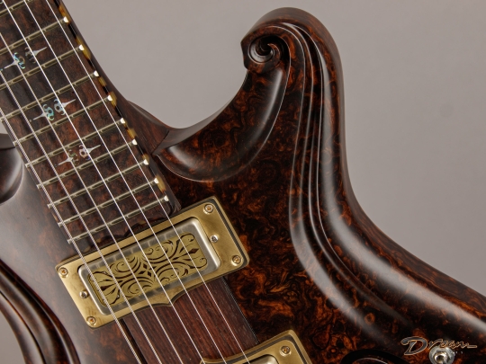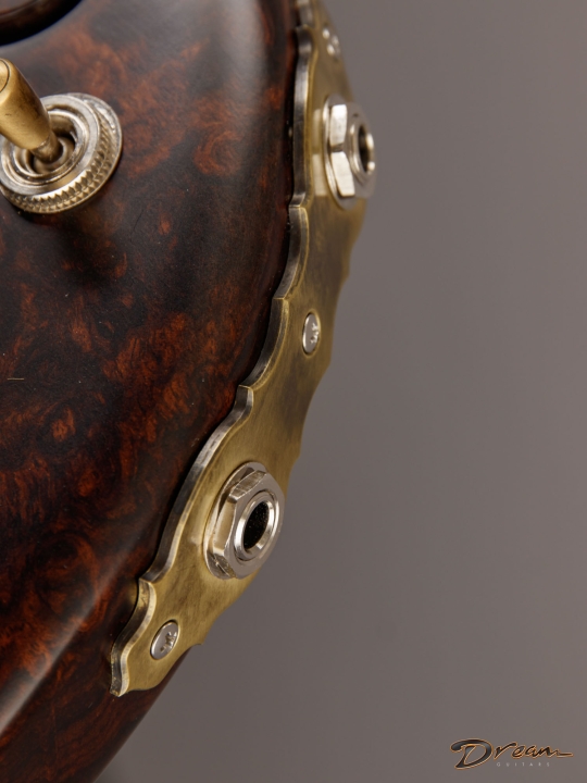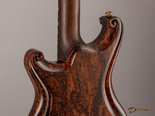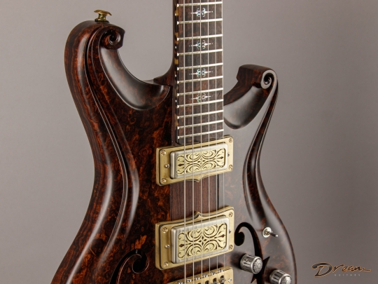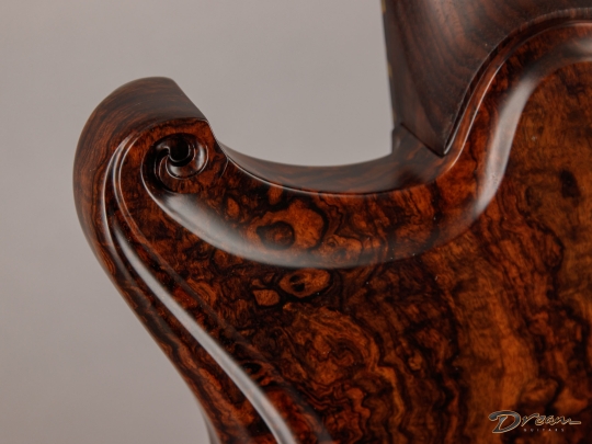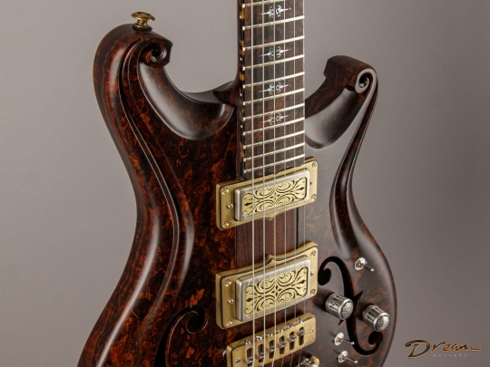 Being crafted entirely from solid burled Rosewood, the Legacy showcases dramatic figuring, a unique tonal character, and a commanding weight. At 9 lbs. 8 oz., it is not for the faint of heart, yet there is something magical in the density and mass of this mighty instrument. It looks like a steampunk Deadhead’s fairytale come to life, and sonically it can live just about anywhere you can imagine. Outfitted with custom hand-wound Scott Walker Humbucker/Firebird pickups with engraved covers, the Legacy also incorporates a full suite of Walker innovations, including an OBEL with a new two-channel buffer, a booster with gain trim pot, a Walker Coil Cut Booster, a brass adjustable bridge and tailpiece, and Walker’s signature aluminum “cactus top” knobs.