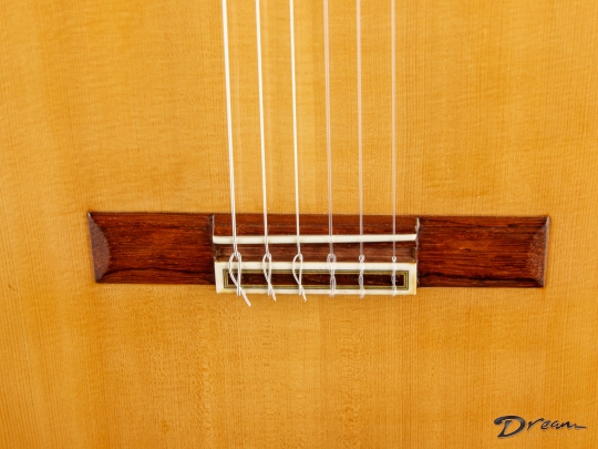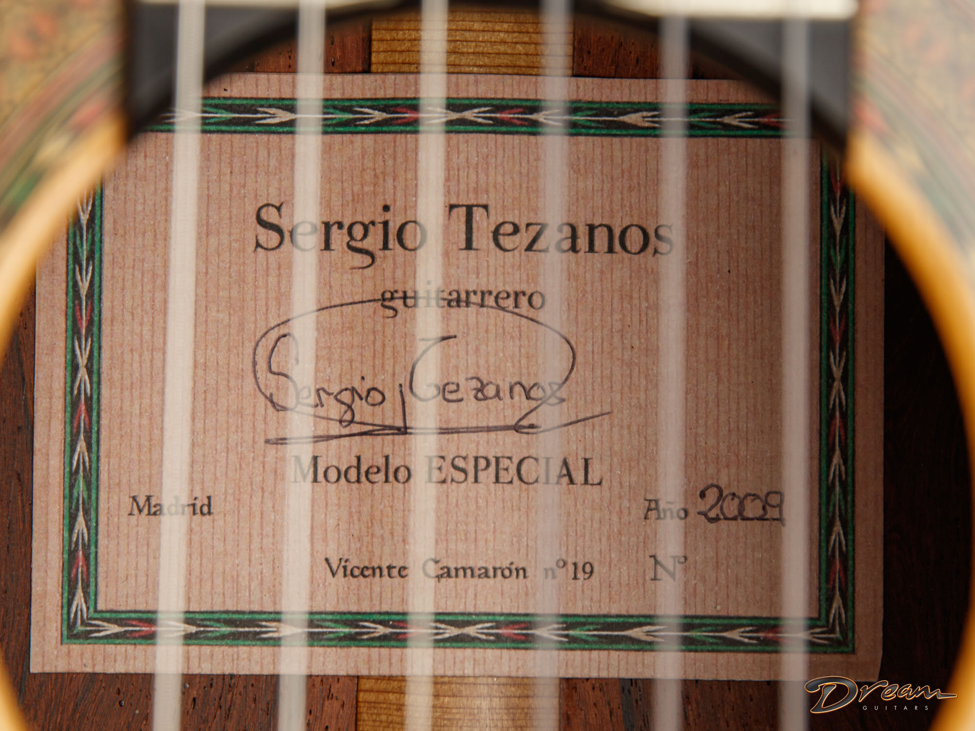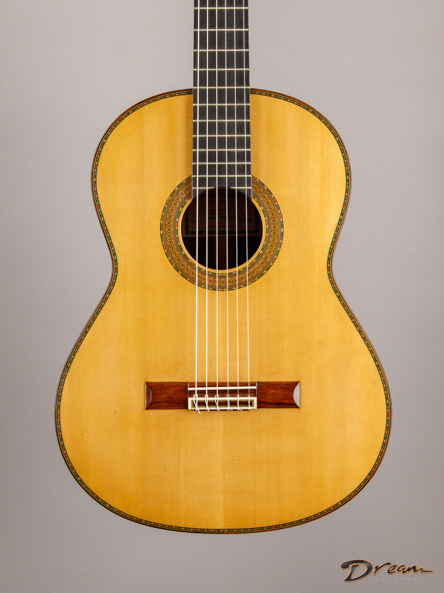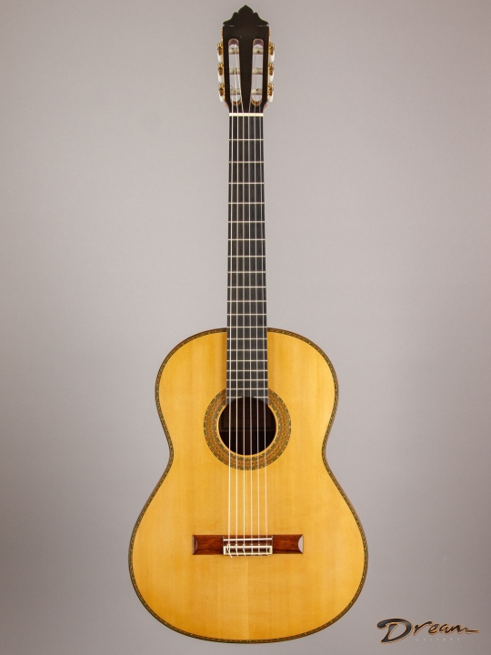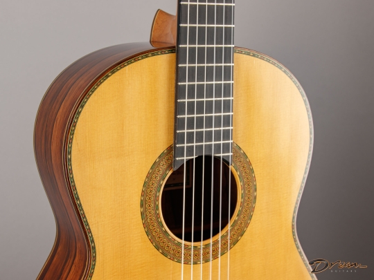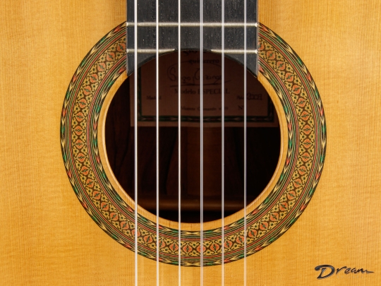 Quick trebles offer a focused fundamental to complement fire and warmth in the mids and bass. Sergio has a sterling reputation in his own right, and has the further distinction of being nephew to famed Madrid-style luthier Mariano Tezanos. This is his top of the line Especial model, showcasing the best tonewoods and Sergio's superlative voicing technique.