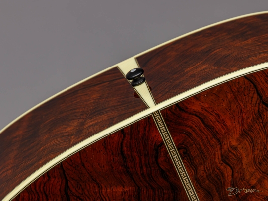 Immediately struck me with the heft and depth of the middle strings. This is a parlor I'd be happy to take home, and that's not a thing I often say. The Santa Cruz team pairs Adirondack Spruce here with intensely figured Brazilian Rosewood and classic prewar appointments; herringbone trim, pyramid bridge, Ivoroid bindings, slotted headstock.
