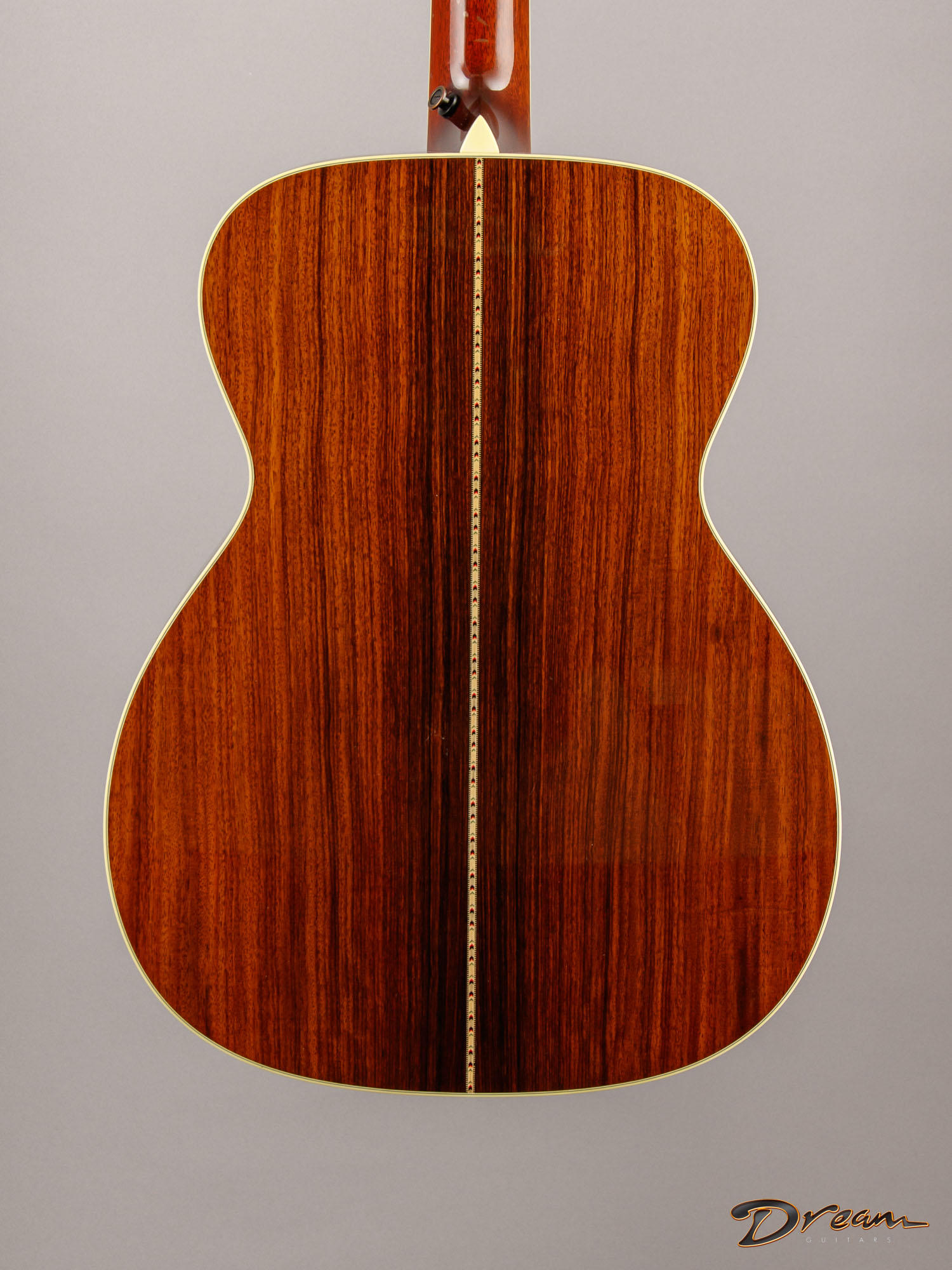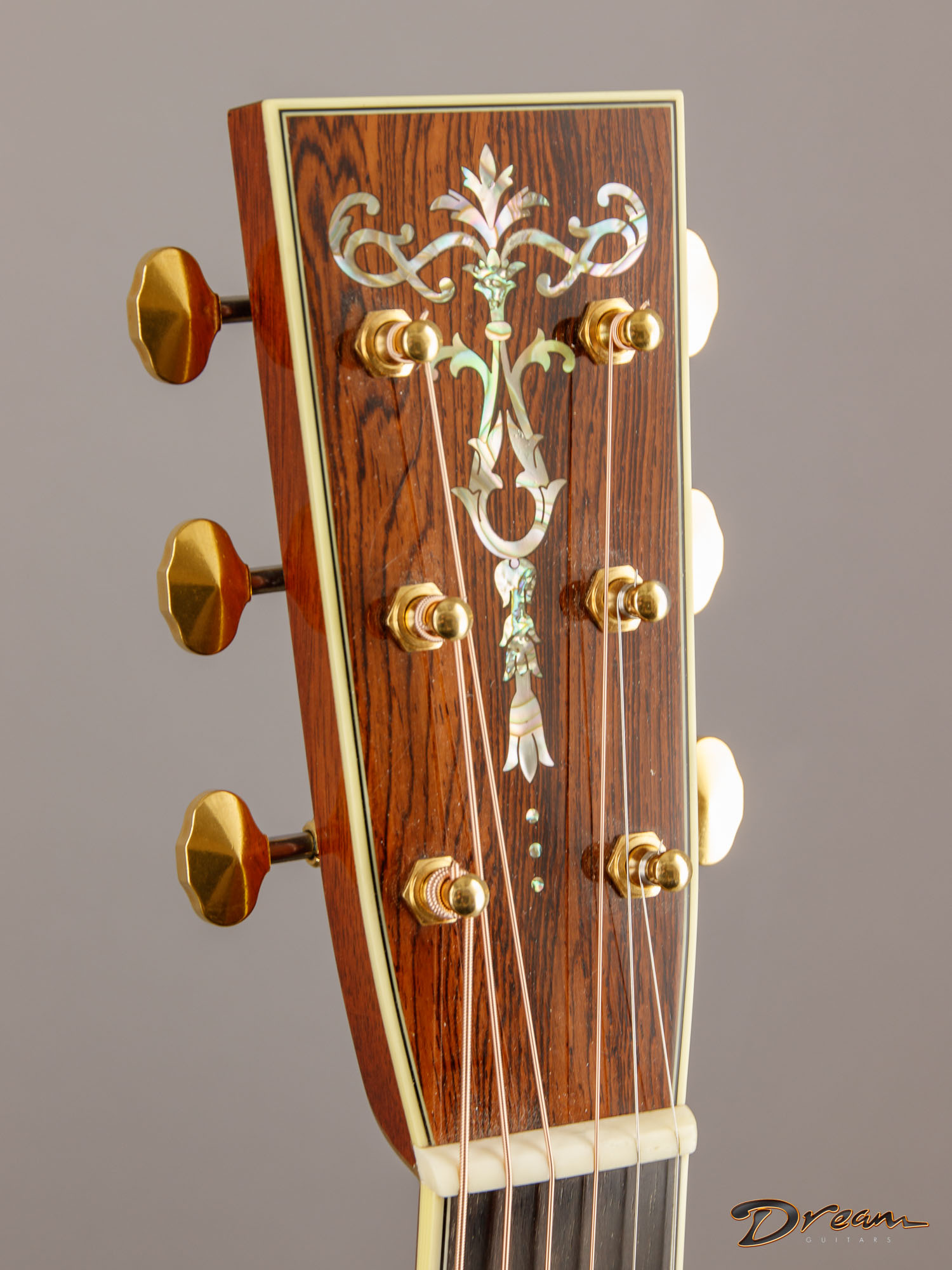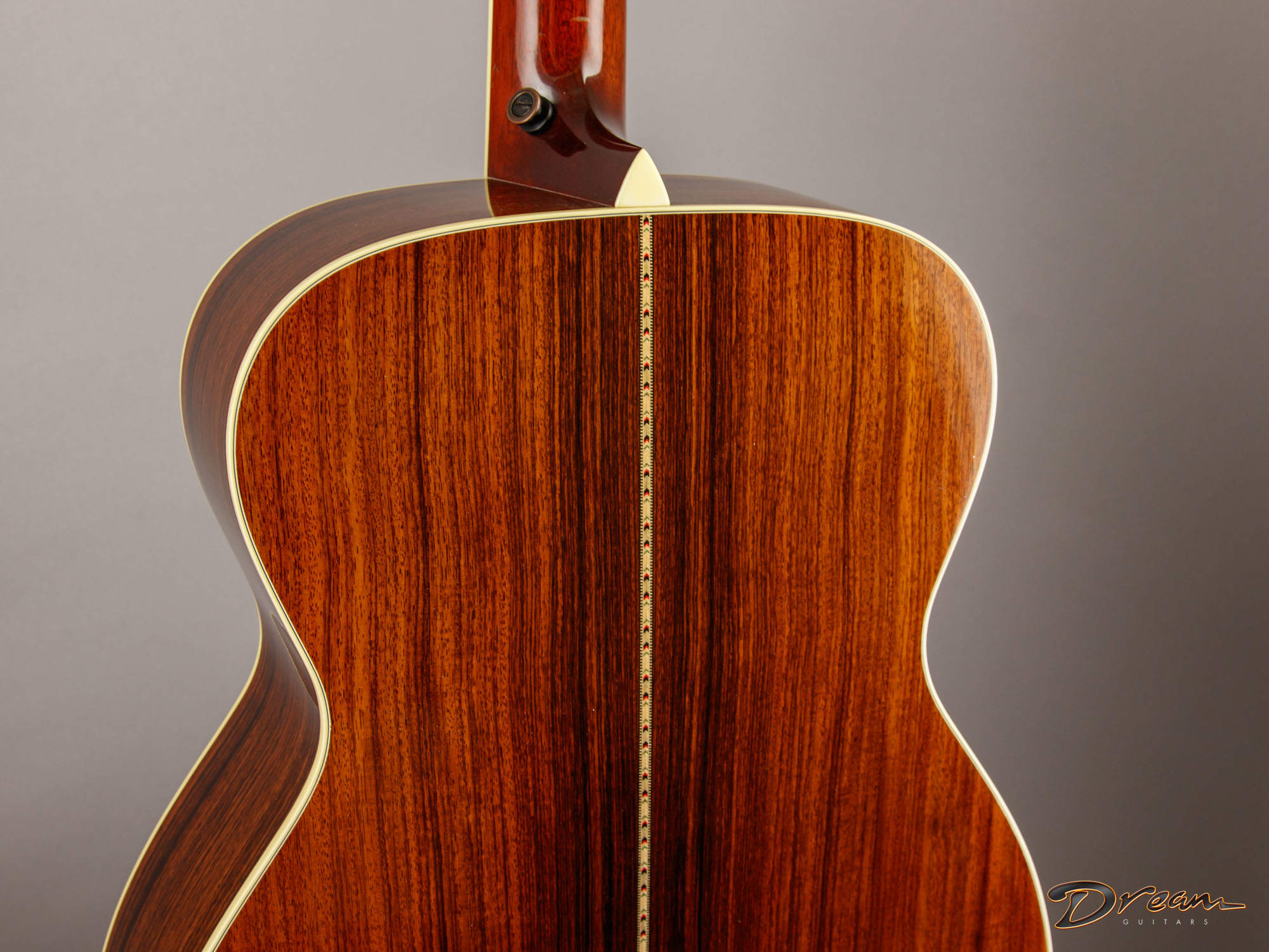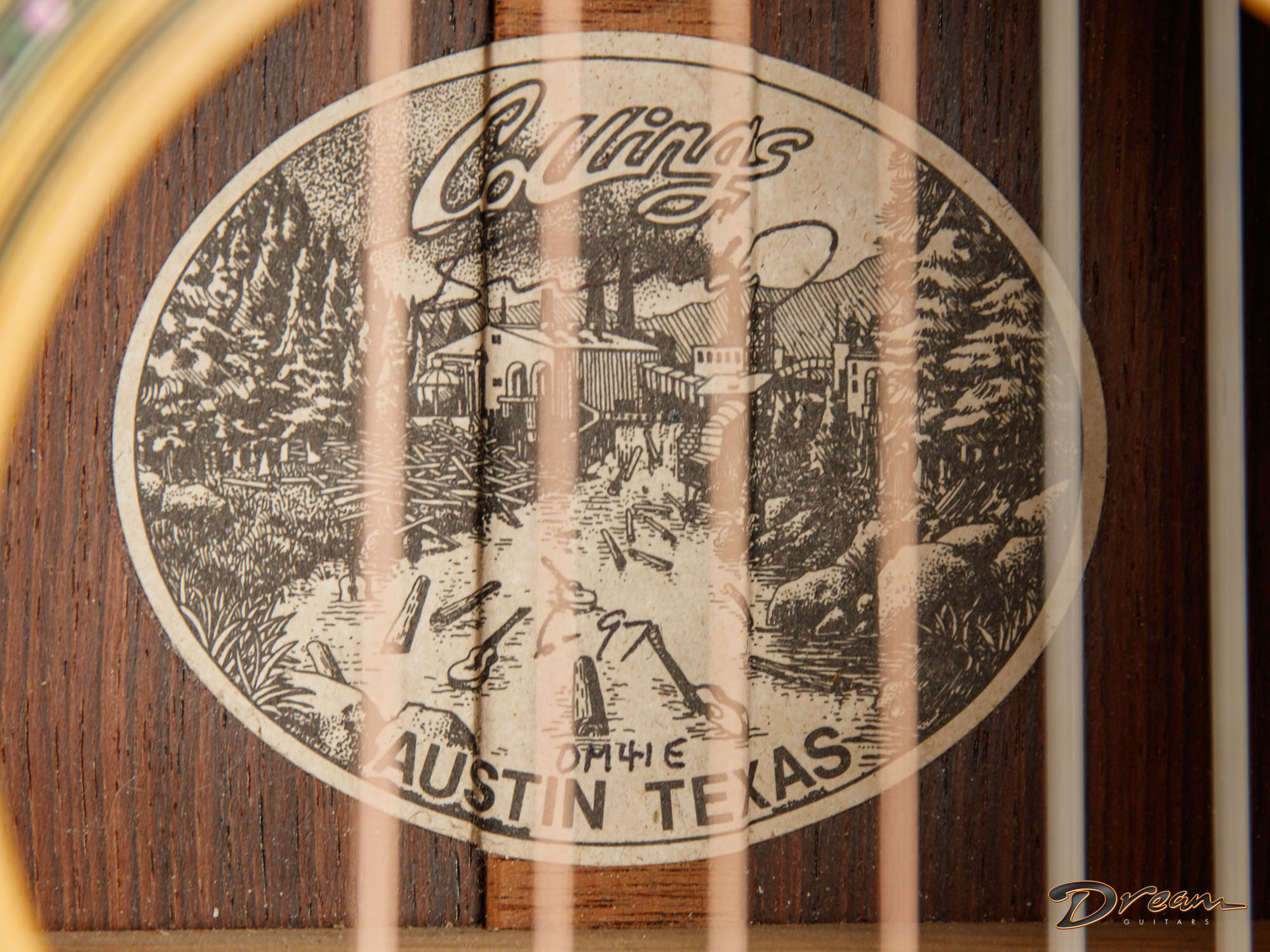 1997 Collings OM-41E with Indian Rosewood back and sides and an Engelmann Spruce top. This OM is truly astounding. The Art Nouveau fingerboard inlays and torch headstock detail lend it an elegant, almost austere look—but the real magic lies in the tone. Indian Rosewood is sometimes dismissed as a lesser tonewood, but this guitar would cause an existential crisis for anyone who believes that.