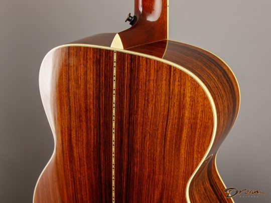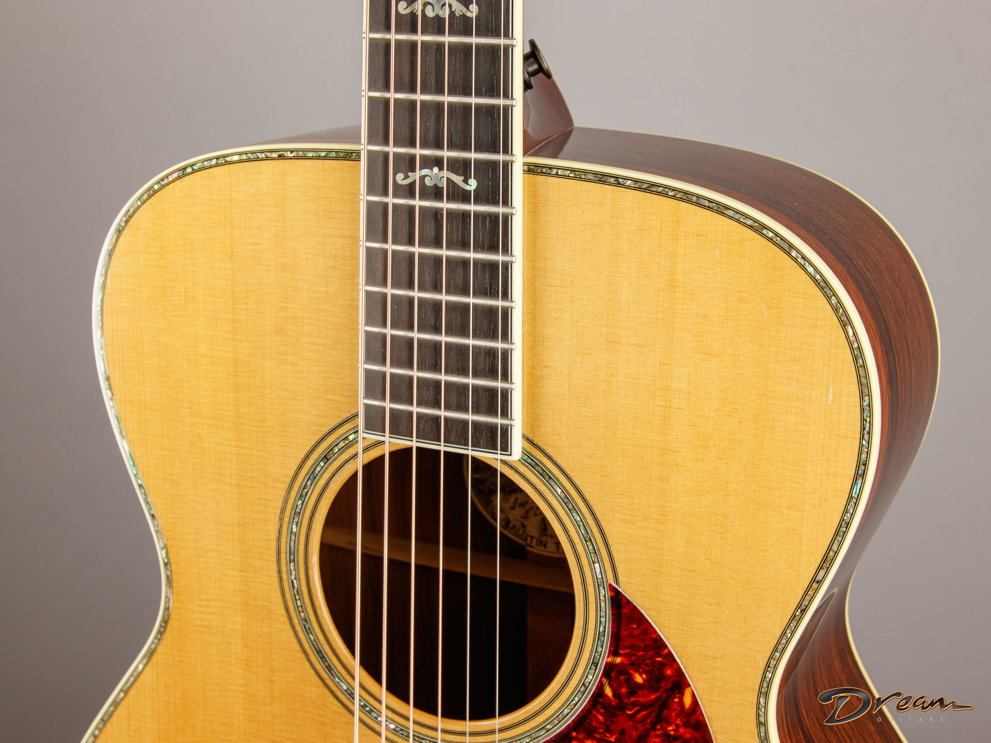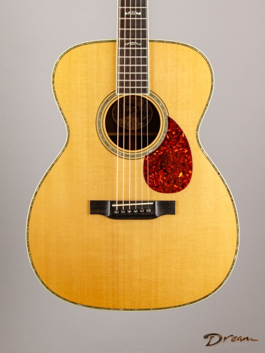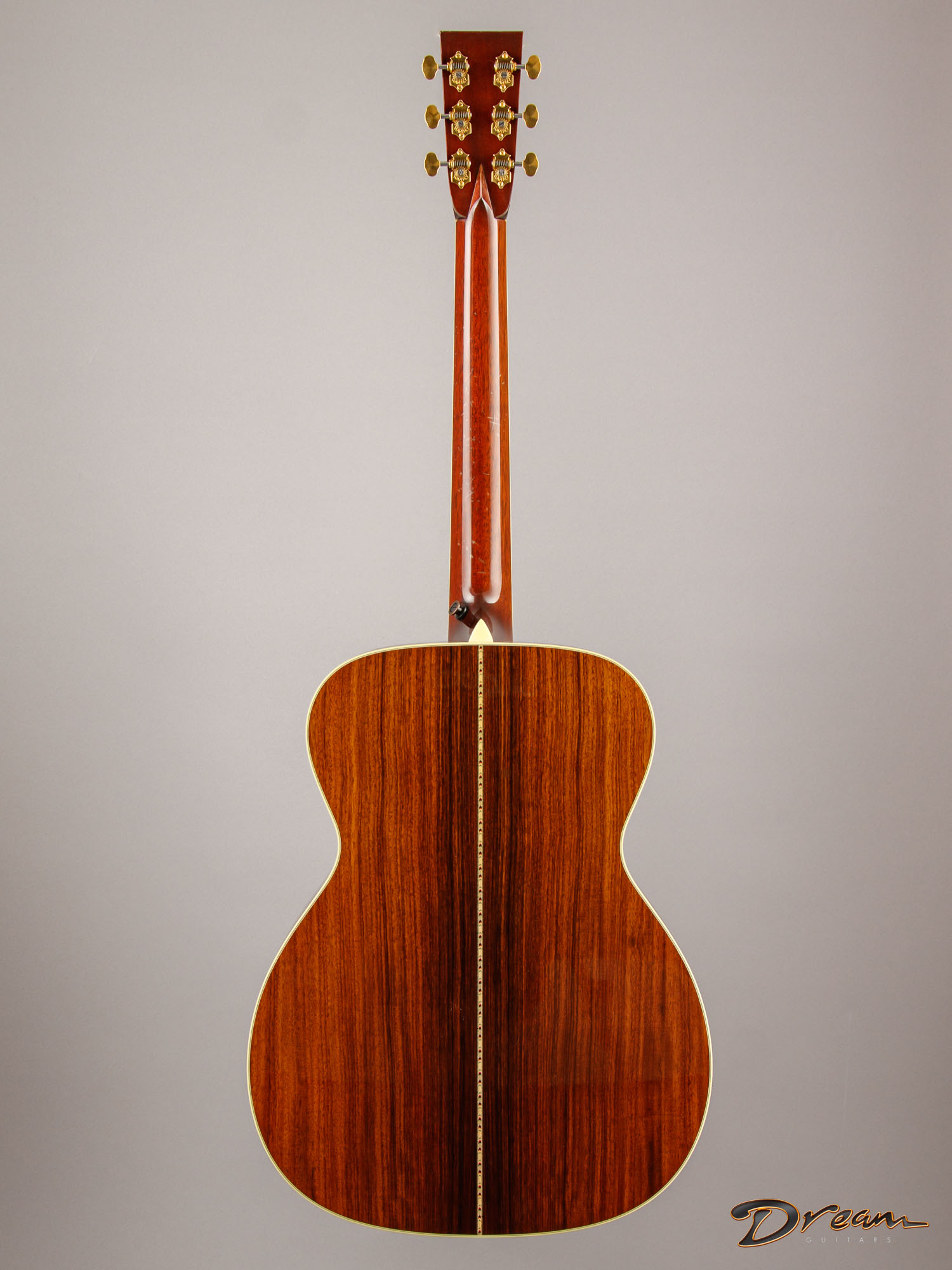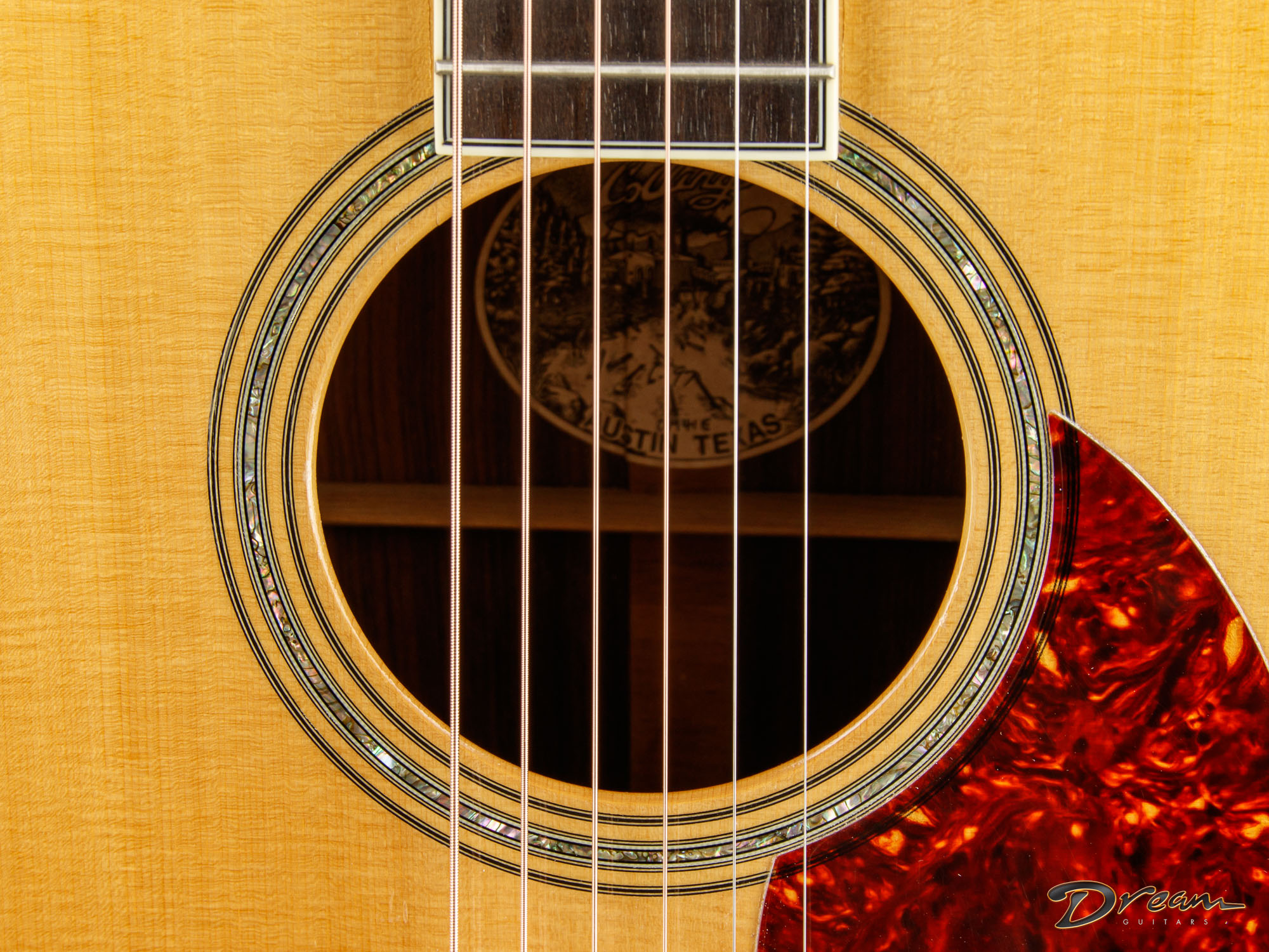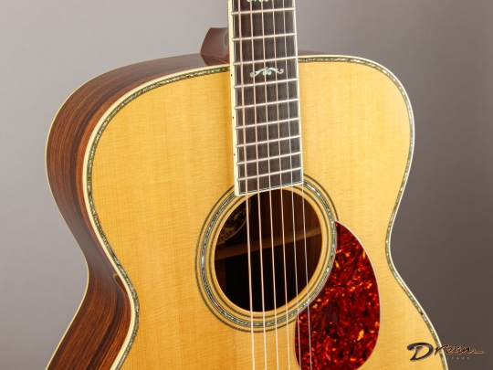 1997 Collings OM-41E with Indian Rosewood back and sides and an Engelmann Spruce top. This OM is truly astounding. The Art Nouveau fingerboard inlays and torch headstock detail lend it an elegant, almost austere look—but the real magic lies in the tone. Indian Rosewood is sometimes dismissed as a lesser tonewood, but this guitar would cause an existential crisis for anyone who believes that.