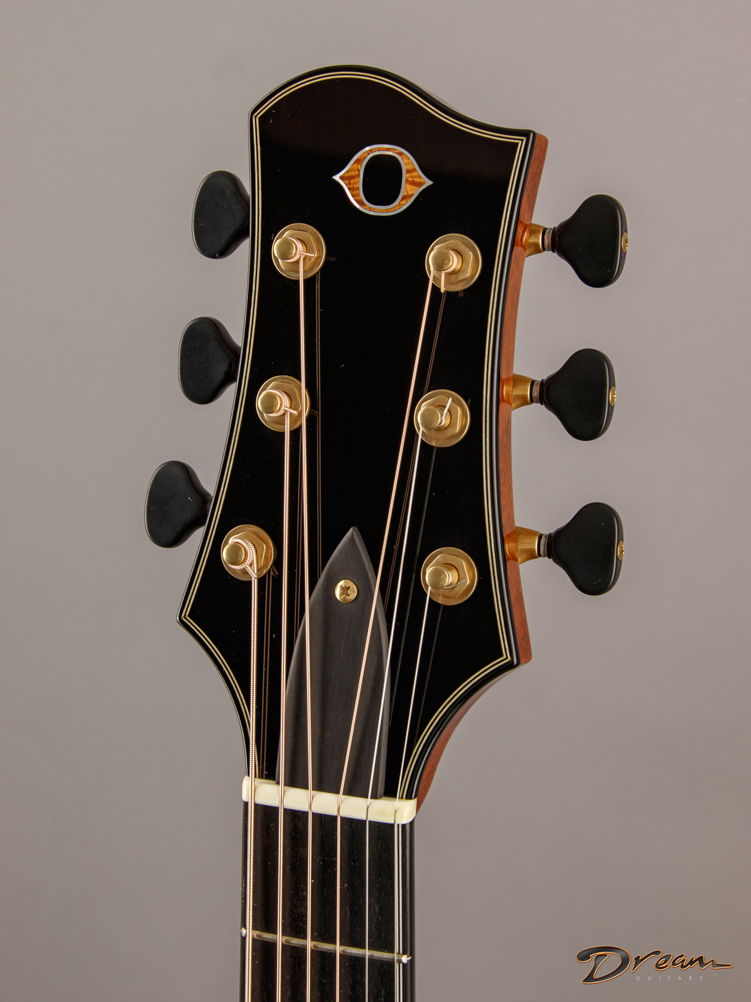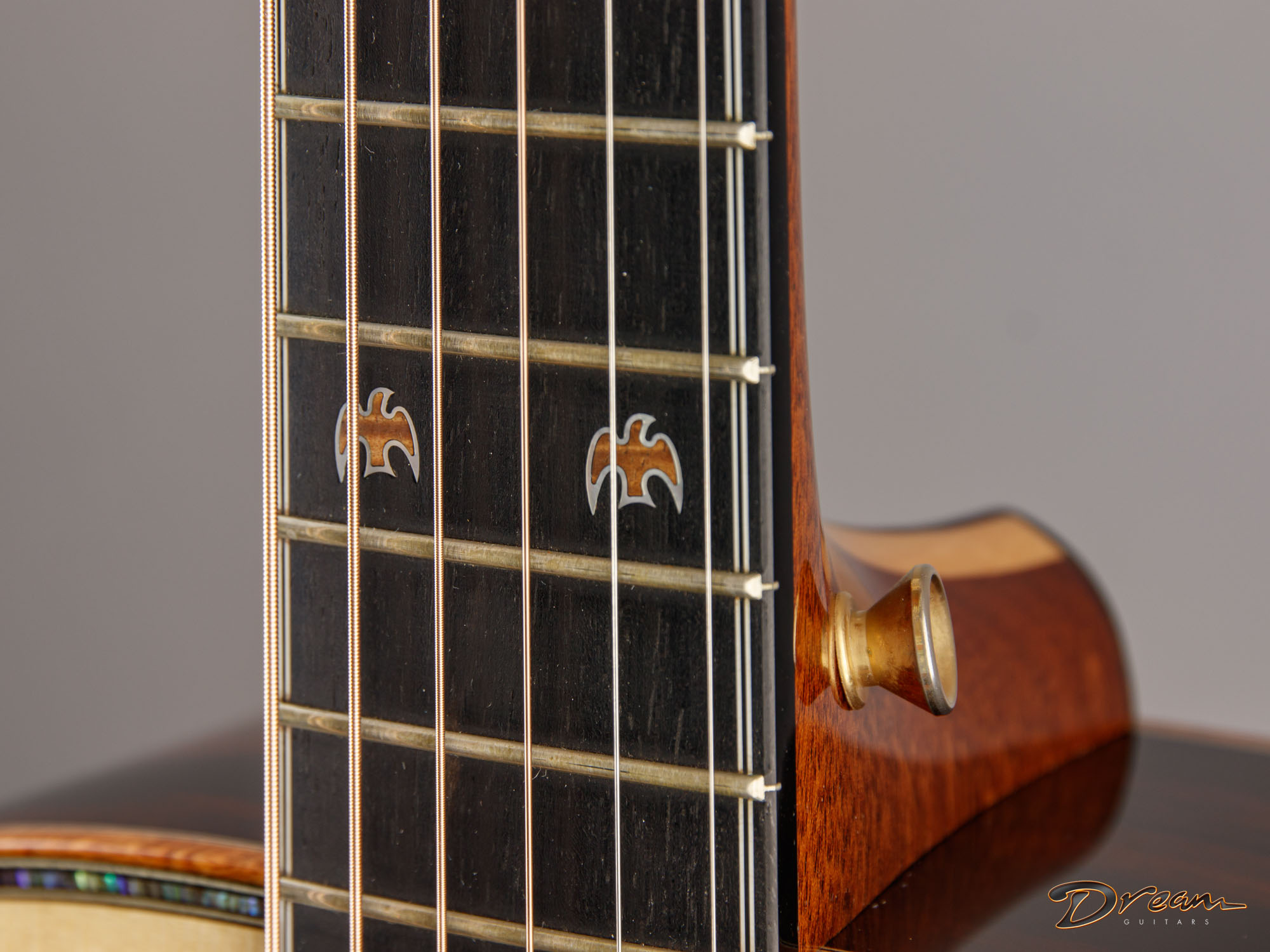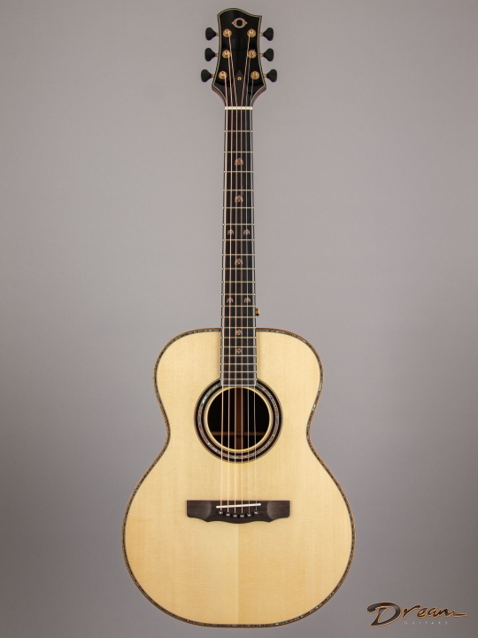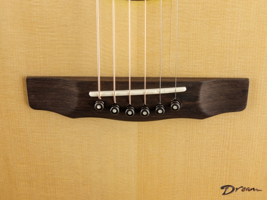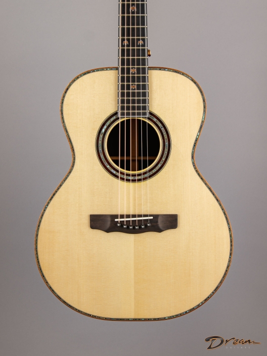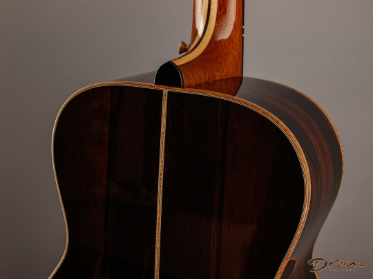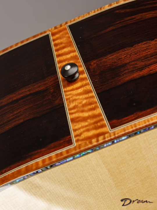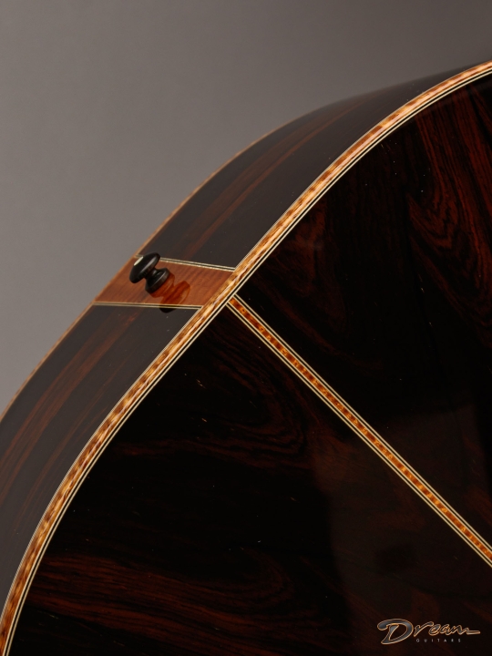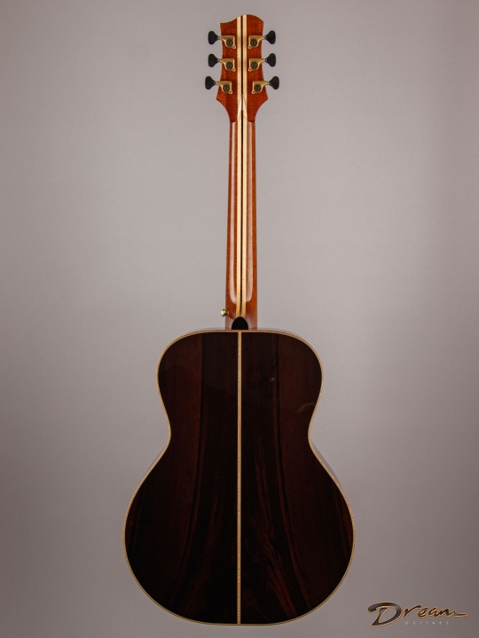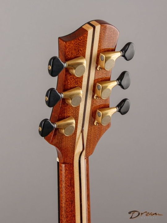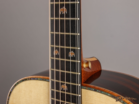 The sparkle of the trebles that's a trademark of all of Jim's guitars is in full force here, as well as in the mids and even the bottom end. The result is a lot of crisp definition for individual notes, adding a quality of clarity and precision to the overall voice. And all of this definition and crispness comes out with a light touch. You want a guitar that requires a mininum of effort for a maximum of response? It's ready here and waiting.