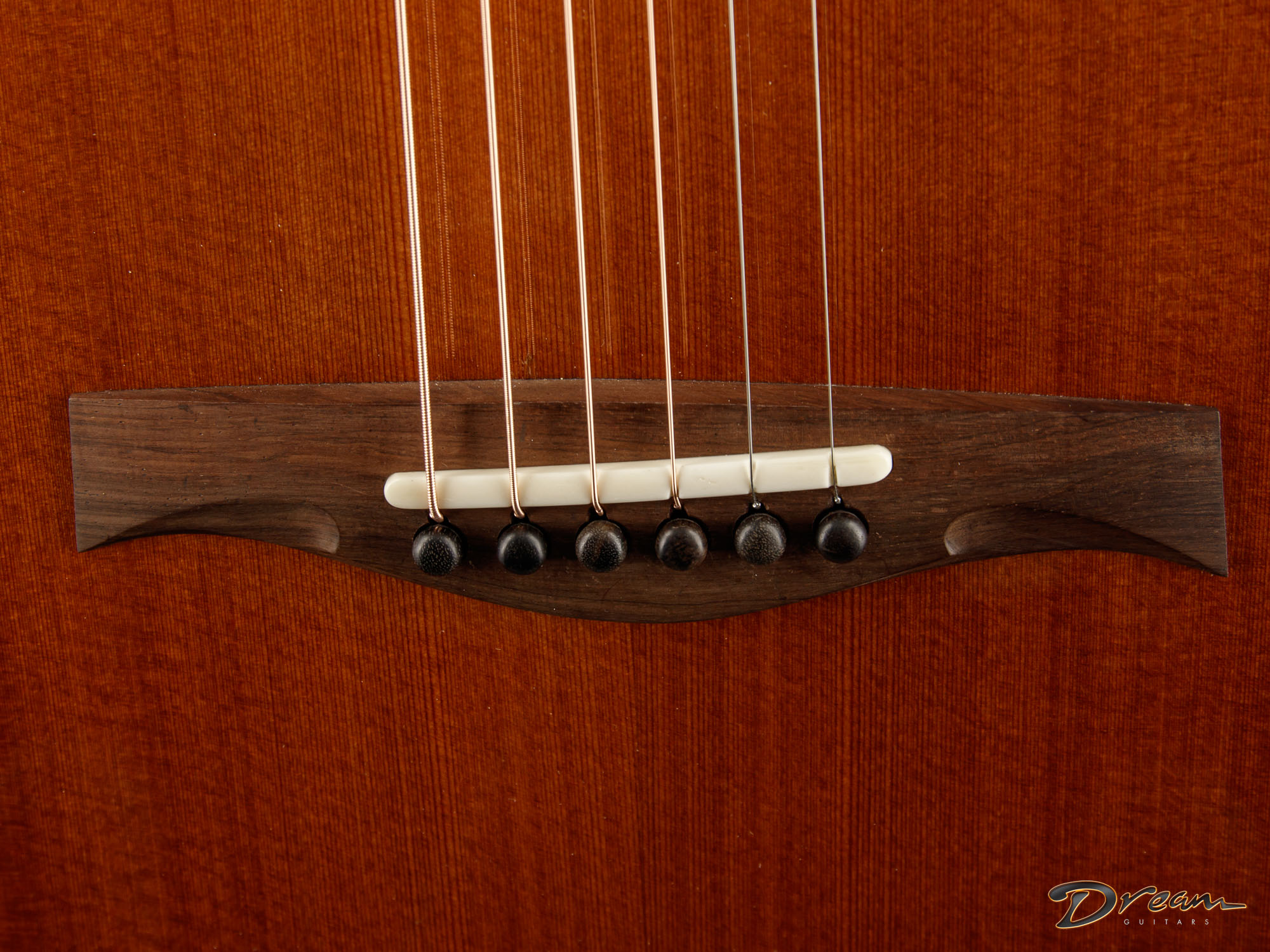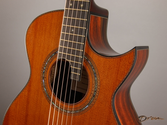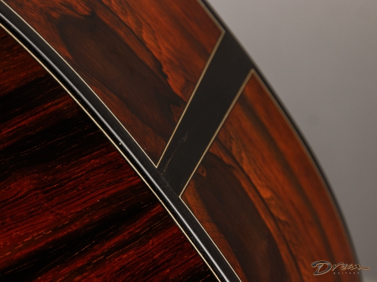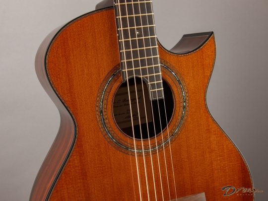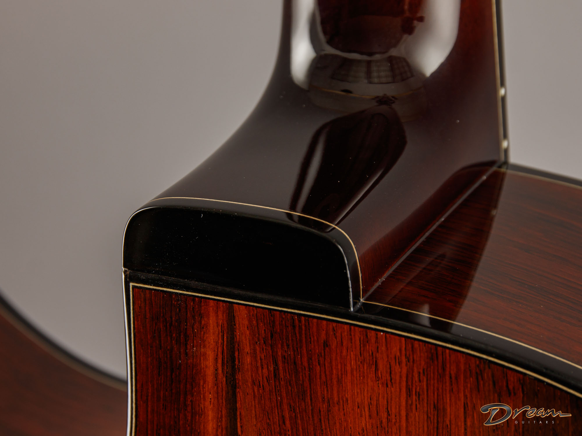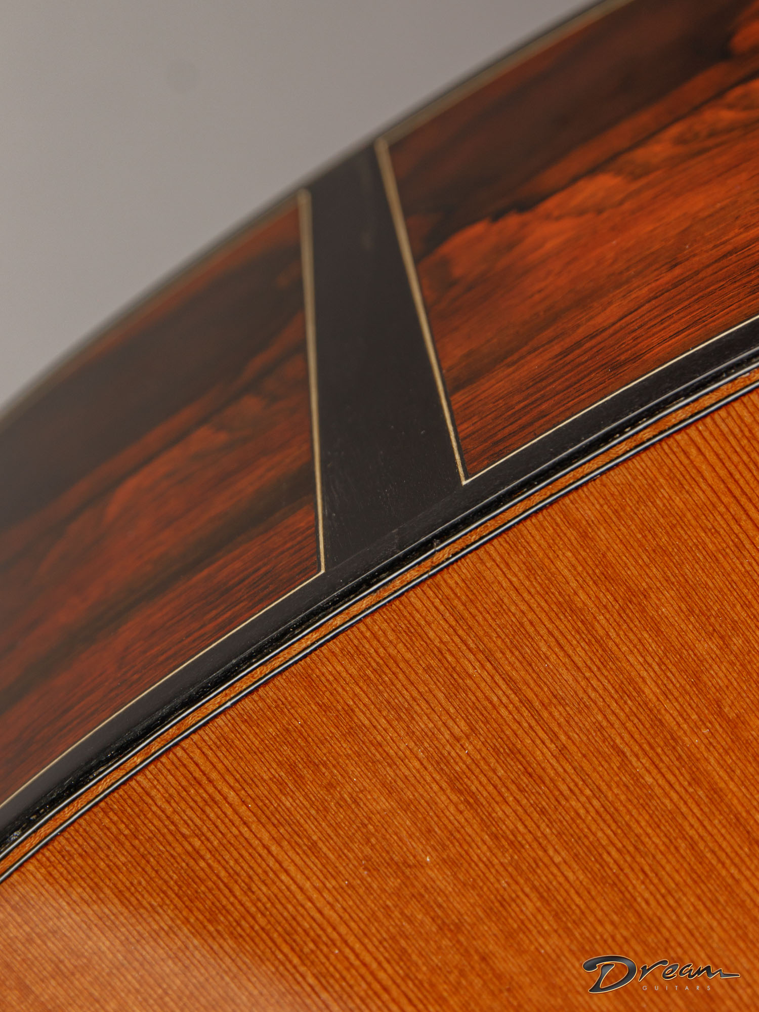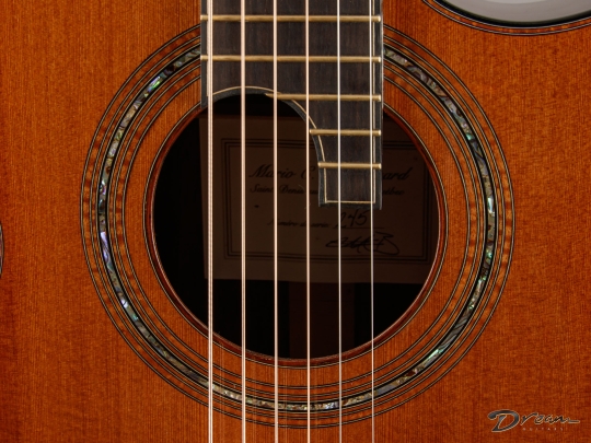 This 2018 OMC shows us exactly why Antoine chooses Mario’s work. Short scale at 25″, twelve frets to the body, insanely beautiful Redwood on top, and the king of tonewoods—Brazilian Rosewood—for the back and sides. The nut and saddle widths are both a bit wider, making this a fingerstyle dream: 1 13/16″ at the nut and 2 3/8″ at the saddle.