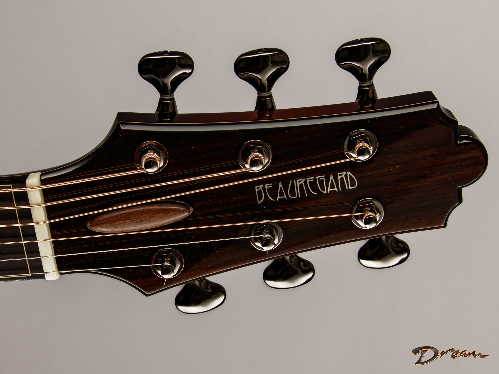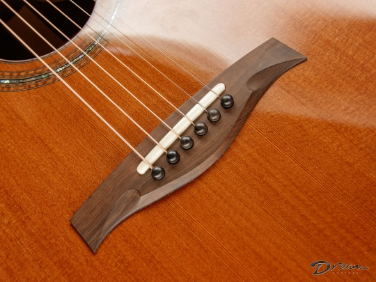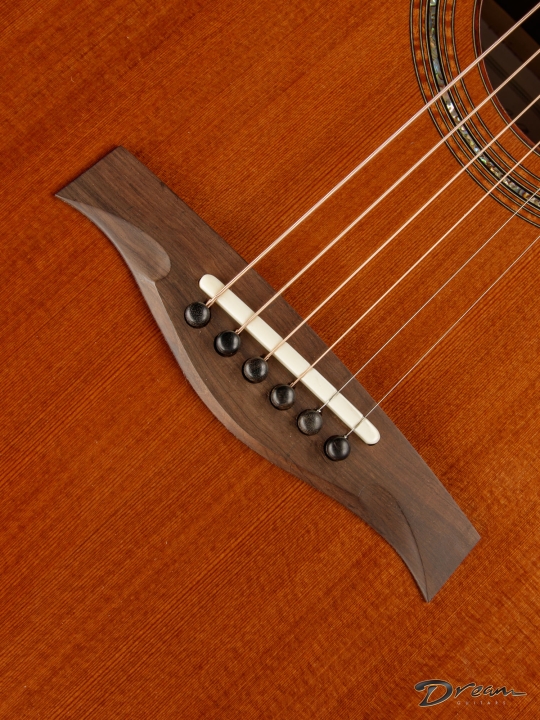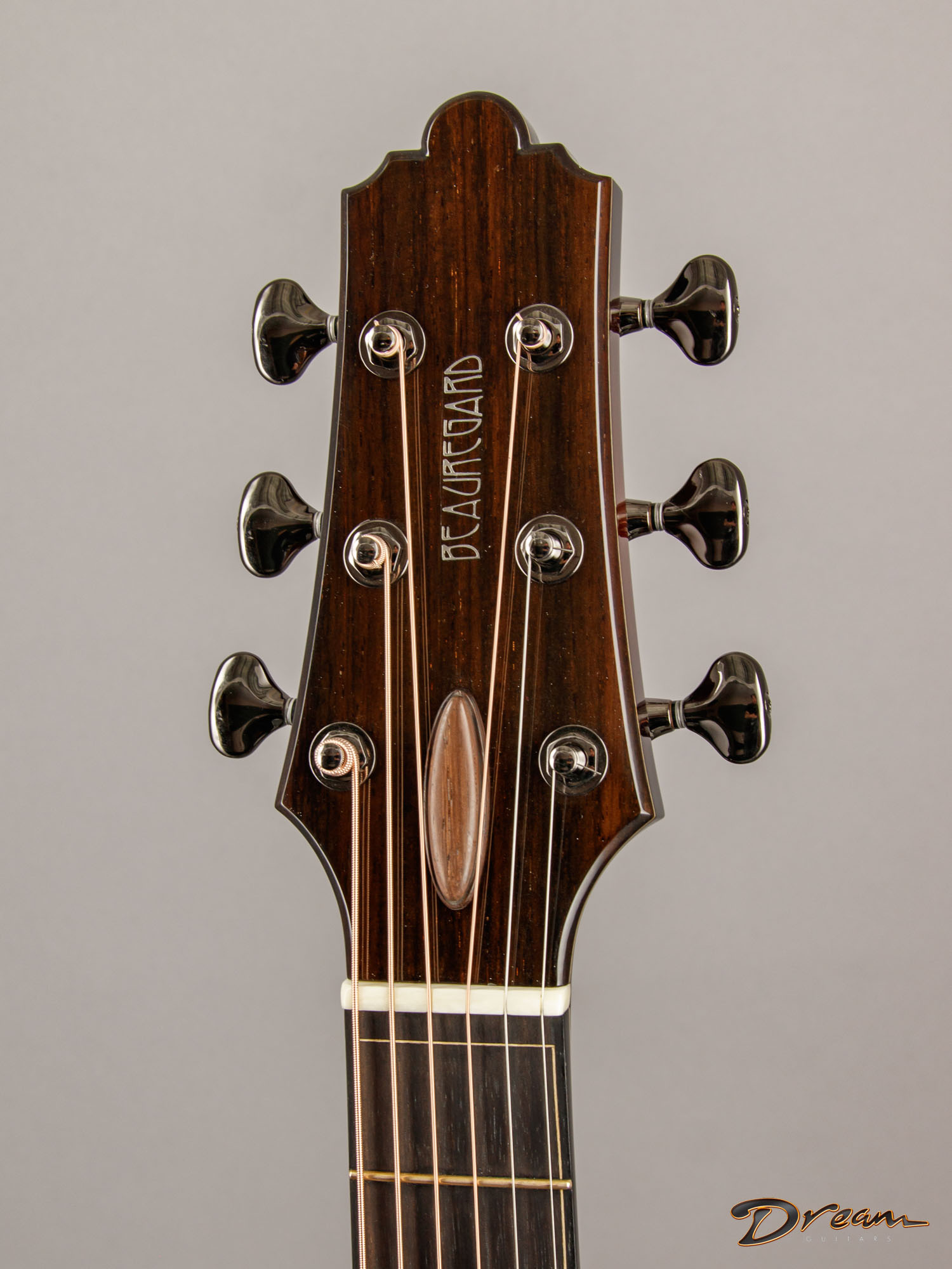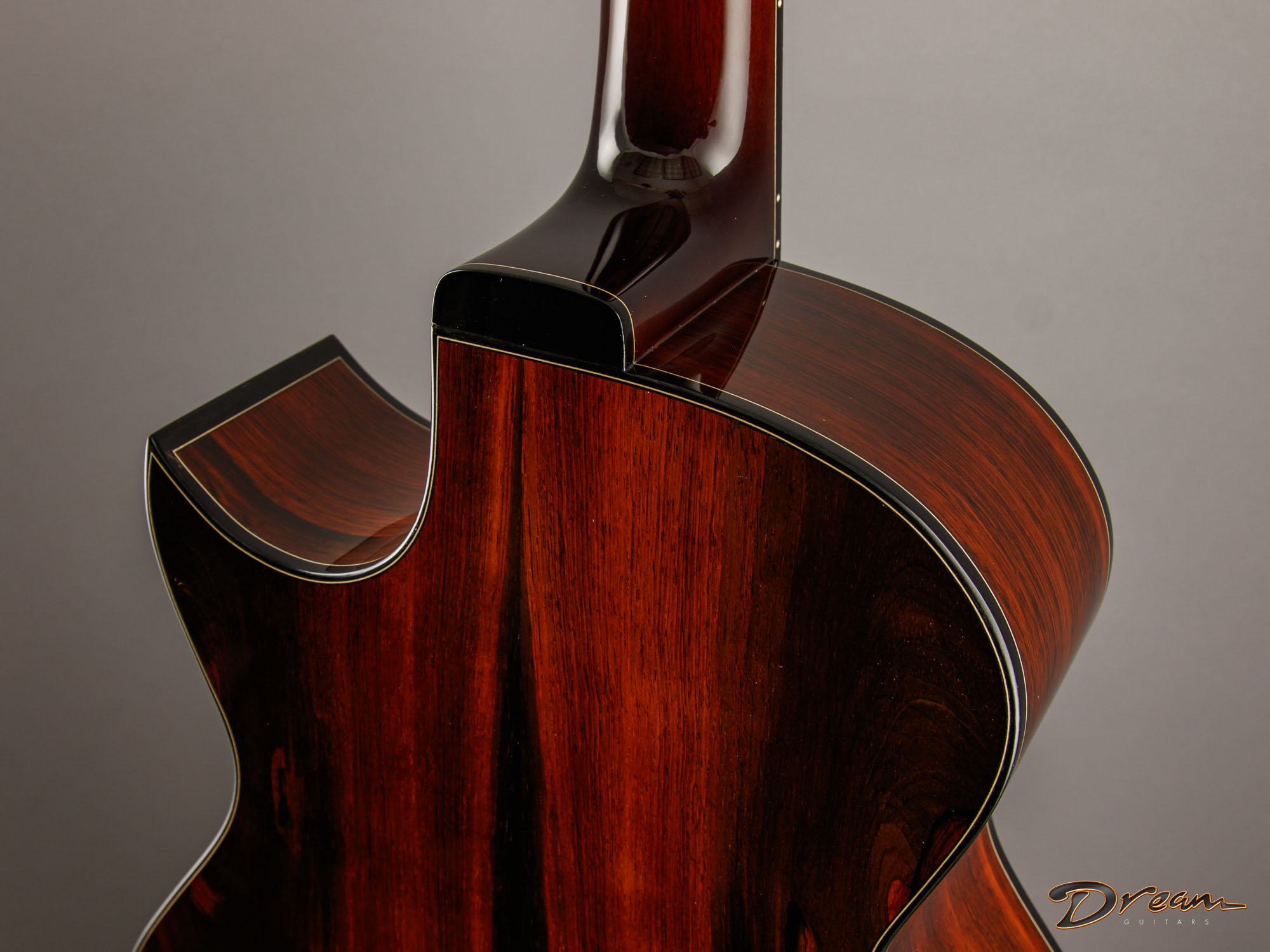 This 2018 OMC shows us exactly why Antoine chooses Mario’s work. Short scale at 25″, twelve frets to the body, insanely beautiful Redwood on top, and the king of tonewoods—Brazilian Rosewood—for the back and sides. The nut and saddle widths are both a bit wider, making this a fingerstyle dream: 1 13/16″ at the nut and 2 3/8″ at the saddle.