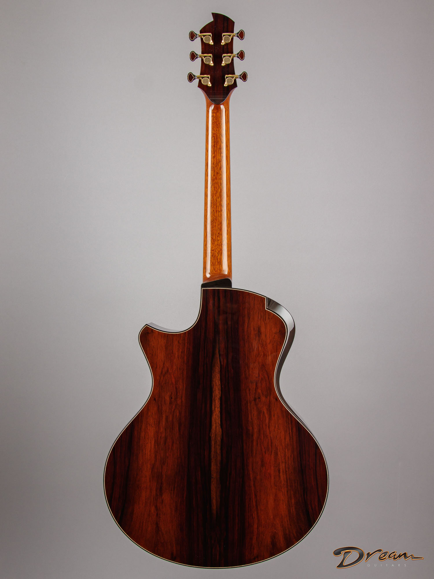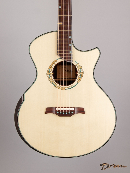 Brand new R.1 from the one and only Tyler Robbins, decked out in Bois de Rose and Carpathian Spruce. Bois de Rose isn’t a tonewood we see every day—and we’d love for that to change. It’s easy to understand why it’s so often considered an alternative to Brazilian Rosewood: it’s as rich in sound as it is in appearance. The dark crimson and burgundy tones of the back and sides are mesmerizing, even before you take in the elegant ornamentation on the top and headplate.